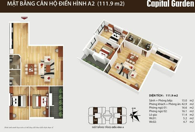- Tầng 2a – 15: 18 căn hộ, diện tích 130.4 m2, 111.9 m2, 109.5 m2, 91.2 m2, 91 m2