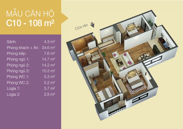 - Căn hộ 3P ngủ: 90m - 91.5m - 102.1m - 109.8m