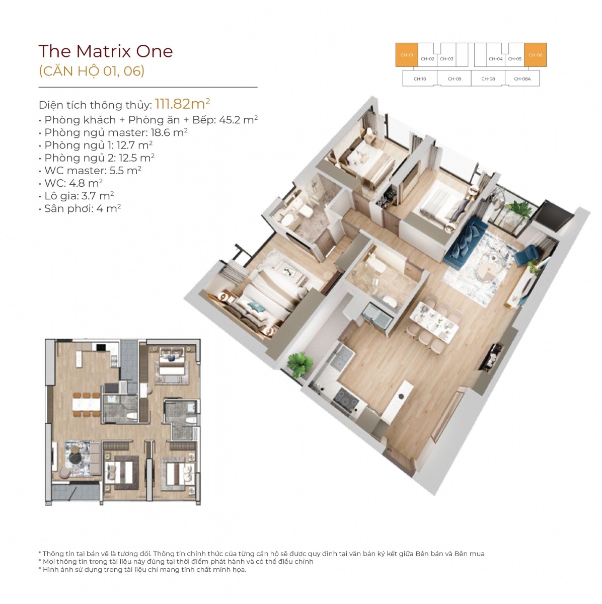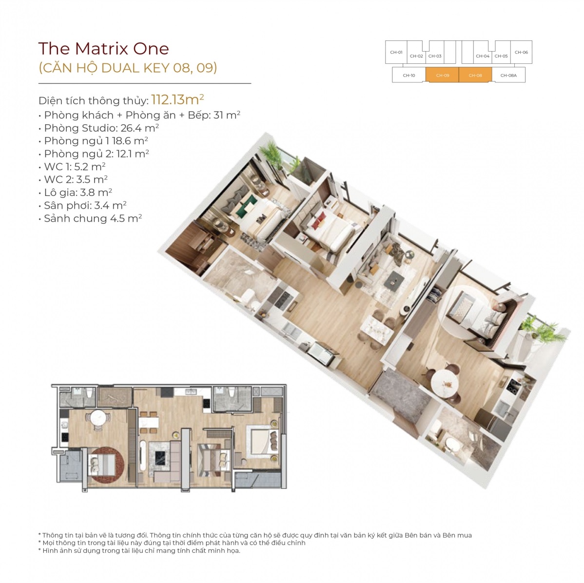 - Phong cách thiết kế đương đại tiếp tục được MIKGroup đưa vào không gian bên trong từng căn hộ The Matrix One, giúp dự án này trở thành kiệt tác kiến trúc thế hệ mới, thể hiện sự đẳng cấp, thượng lưu của những chủ nhân ưu tú. Các căn hộ được thiết kế đa dạng, từ 2-3 phòng ngủ với diện tích linh hoạt từ 86-112m2. Nổi bật là căn hộ hạng sang Dual key được thiết kế theo hình thức "2 trong 1", tách biệt thành 2 không gian riêng tư, có thể sử dụng vào nhiều mục đích khác nhau của gia chủ, vừa để ở vừa để đầu tư hoặc chung sống trong gia đình đa thế hệ.