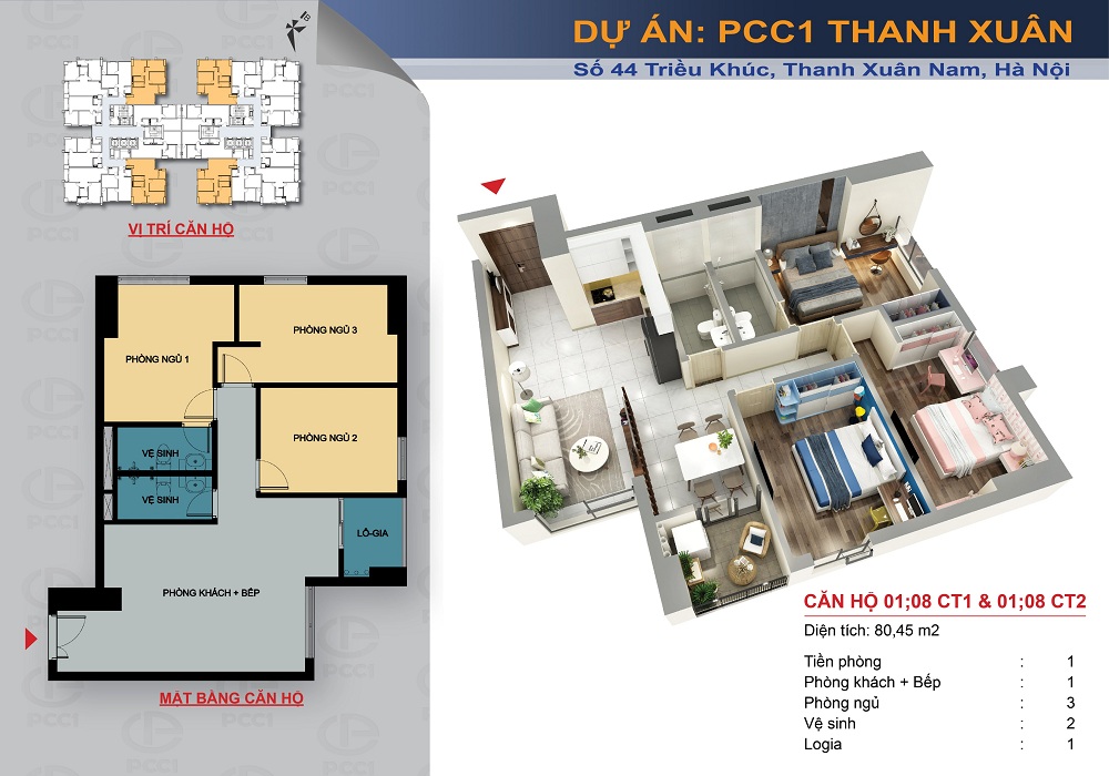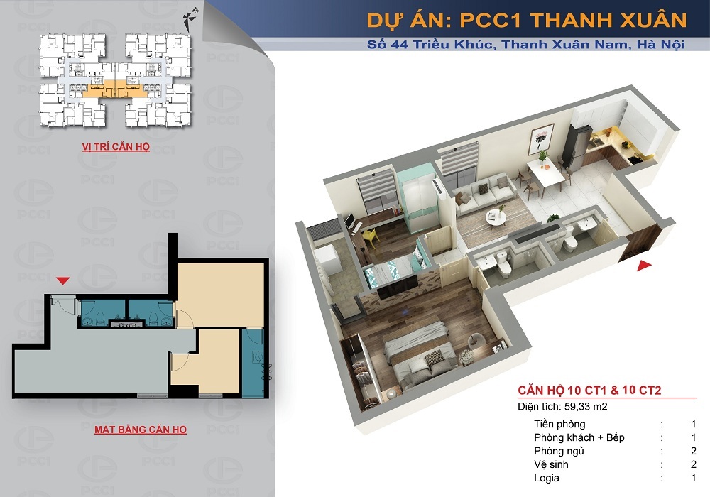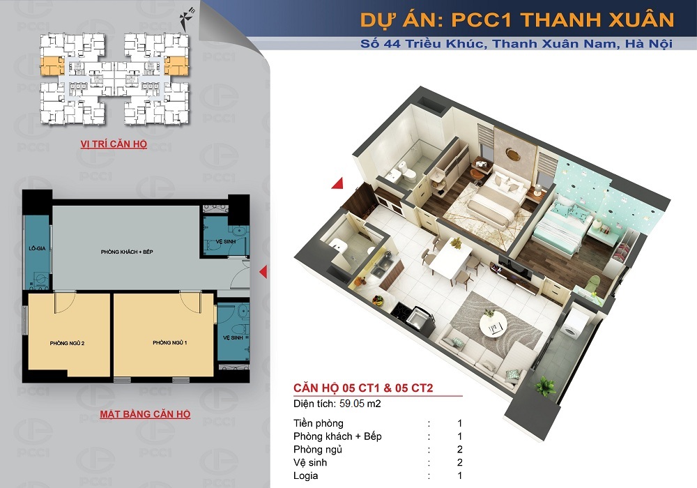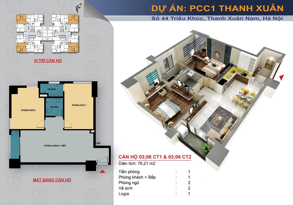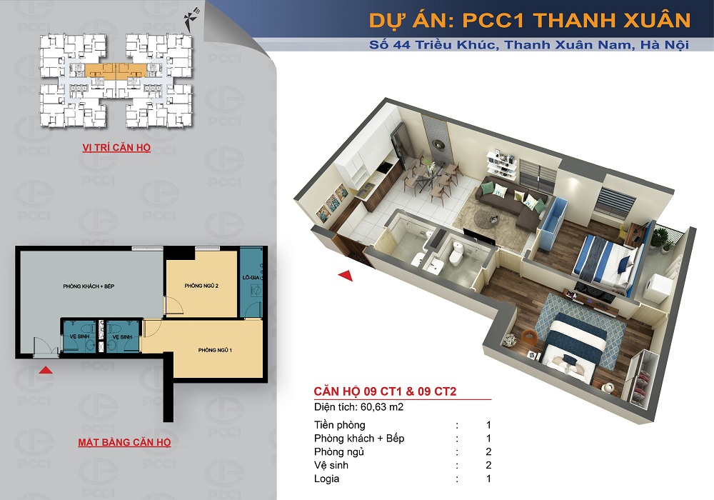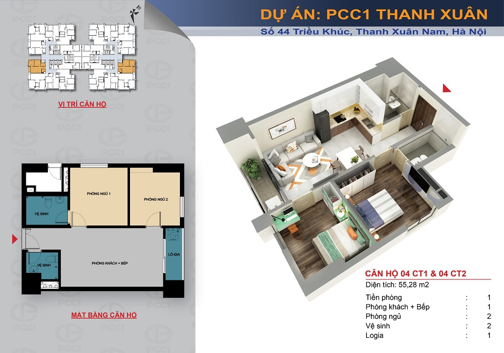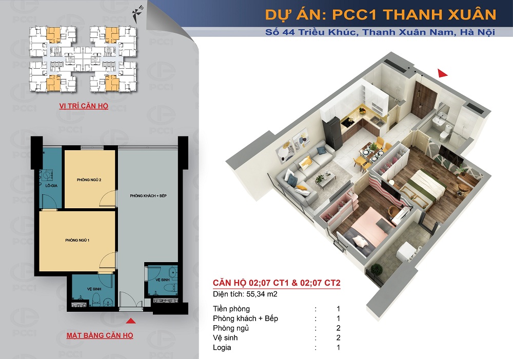 - “Chung cư PCC1 Thanh Xuân (44 Triều Khúc) sở hữu 27 tầng nổi và 3 tầng hầm đỗ xe, diện tích căn hộ nhỏ 2 phòng ngủ từ 55 – 80m2, nên PCC1 Thanh Xuân chiếm được cảm tình rất lớn của các cặp vợ chồng trẻ, không chỉ bởi mức giá hợp lý chỉ từ 1,8 tỷ căn 2 phòng ngủ mà còn bởi thiết kế thông minh, linh hoạt, tận dụng khéo léo từng khoảng không gian”.