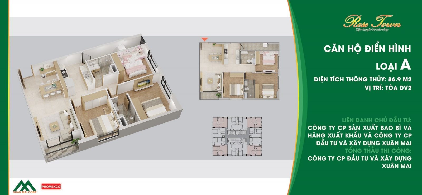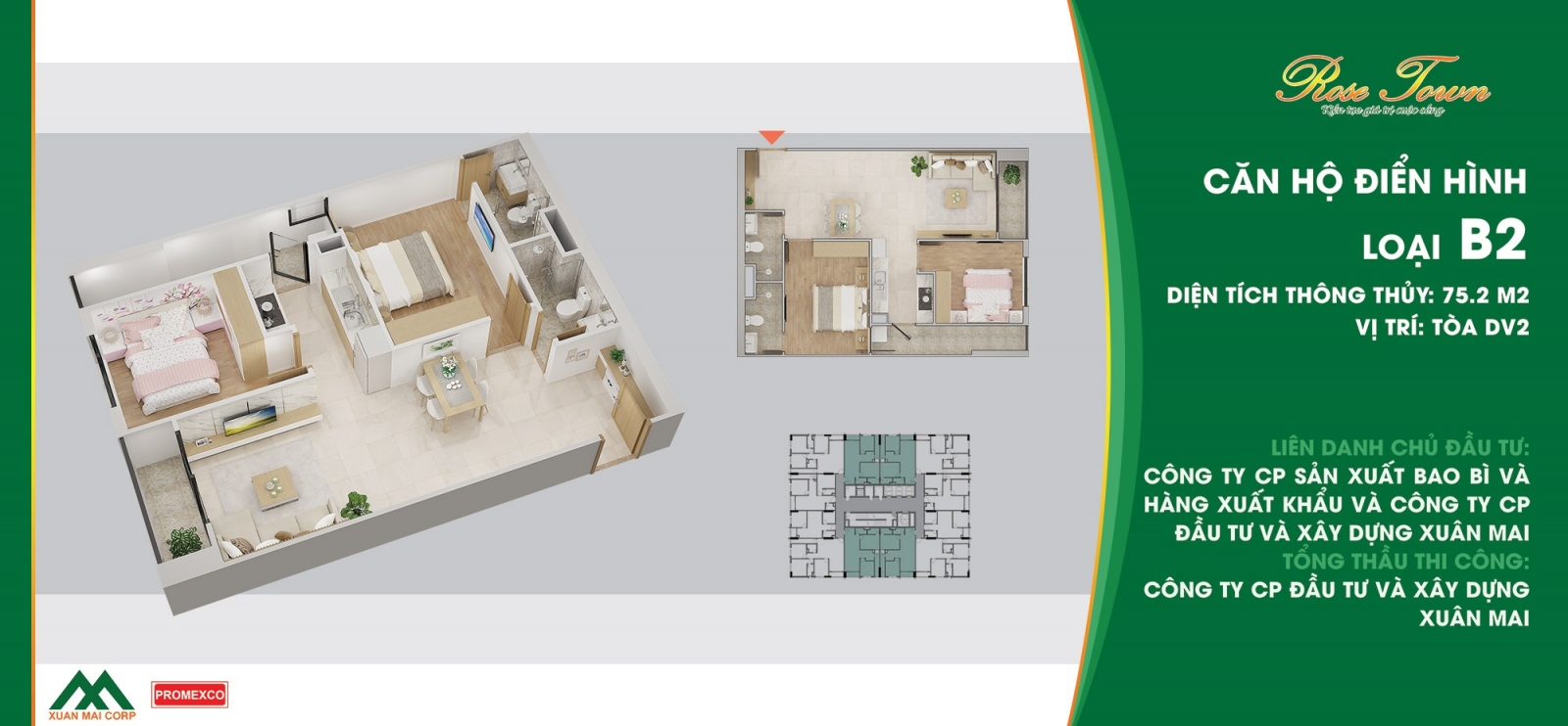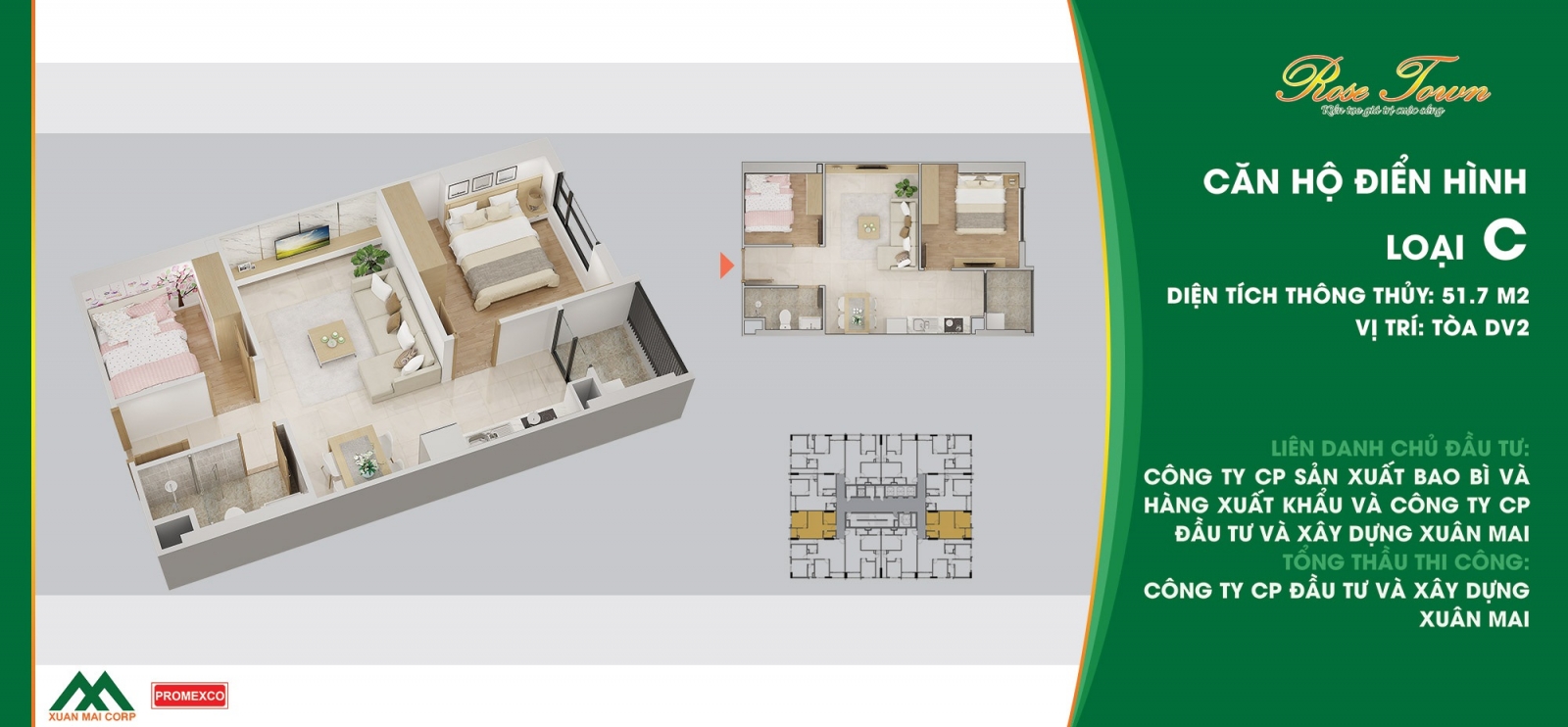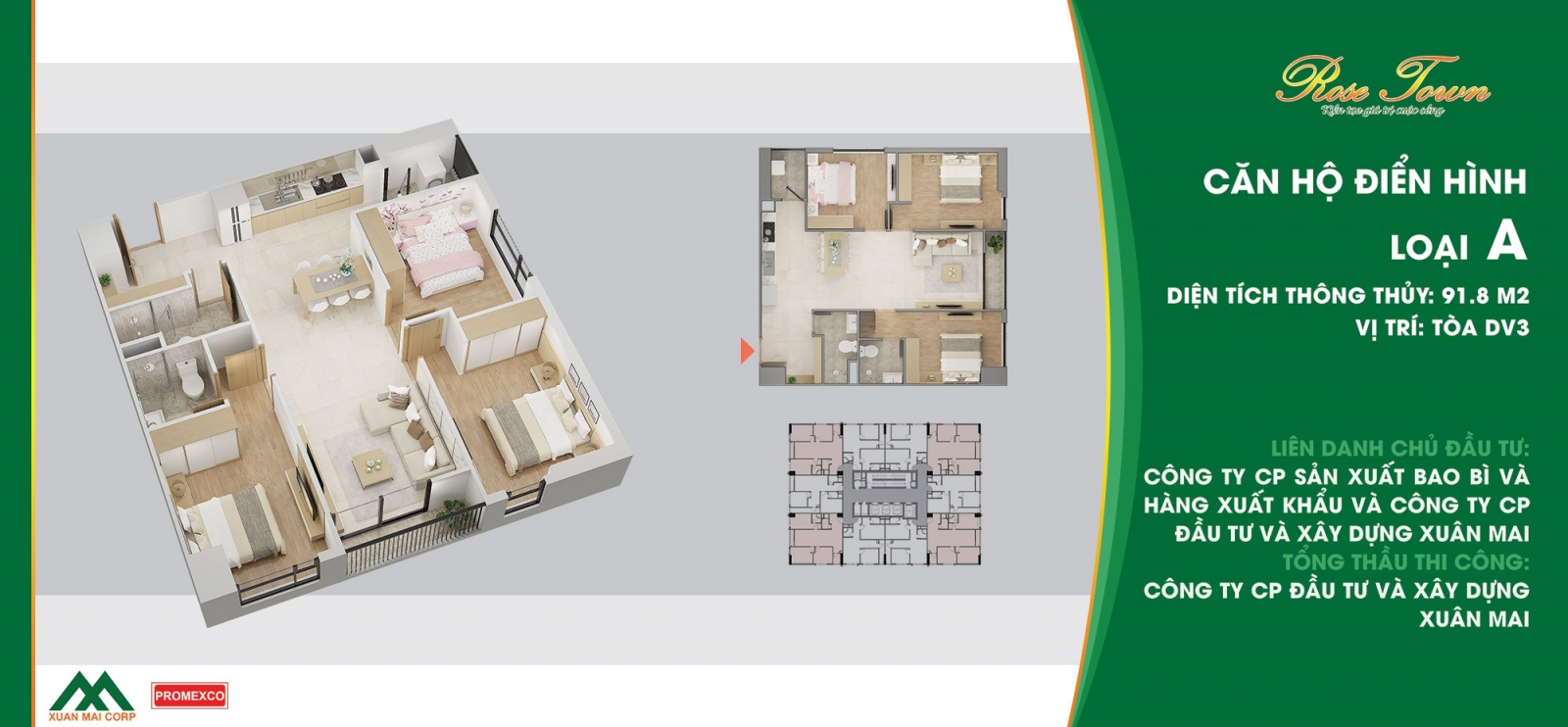 - Công ty tư vấn và thiết kế Xuân Mai luôn đề cao tính tiện nghi và tối ưu công năng sử dụng căn hộ cho gia chủ. Các căn hộ Rose Town có diện tích linh hoạt từ 52 - 87m2, thiết kế 2 – 3 phòng ngủ, phù hợp với các gia đình trẻ cũng như gia đình đa thế hệ. Các kiến trúc sư của Xuân Mai Corp đã tính toán chi tiết để tất cả các phòng trong căn hộ đều có ban công và cửa sổ rất thoáng rộng, được bố trí khoa học, gần gũi với thiên nhiên.