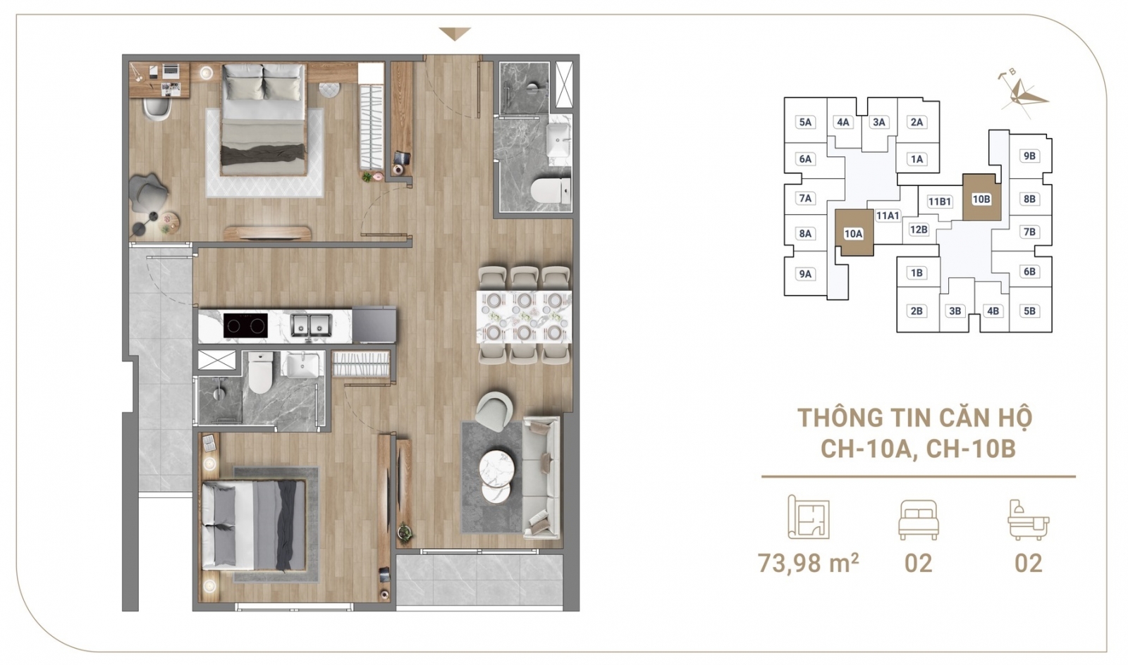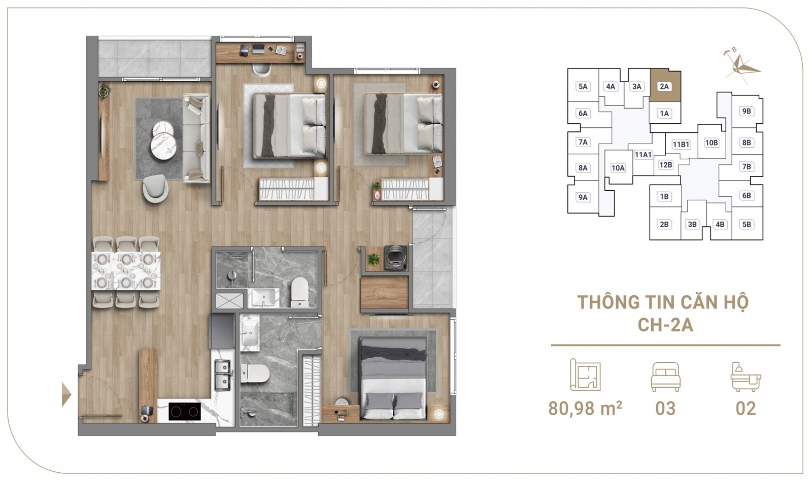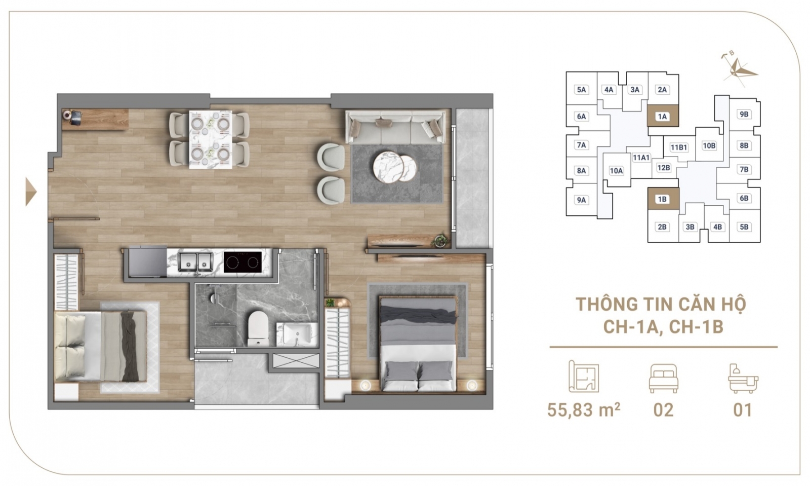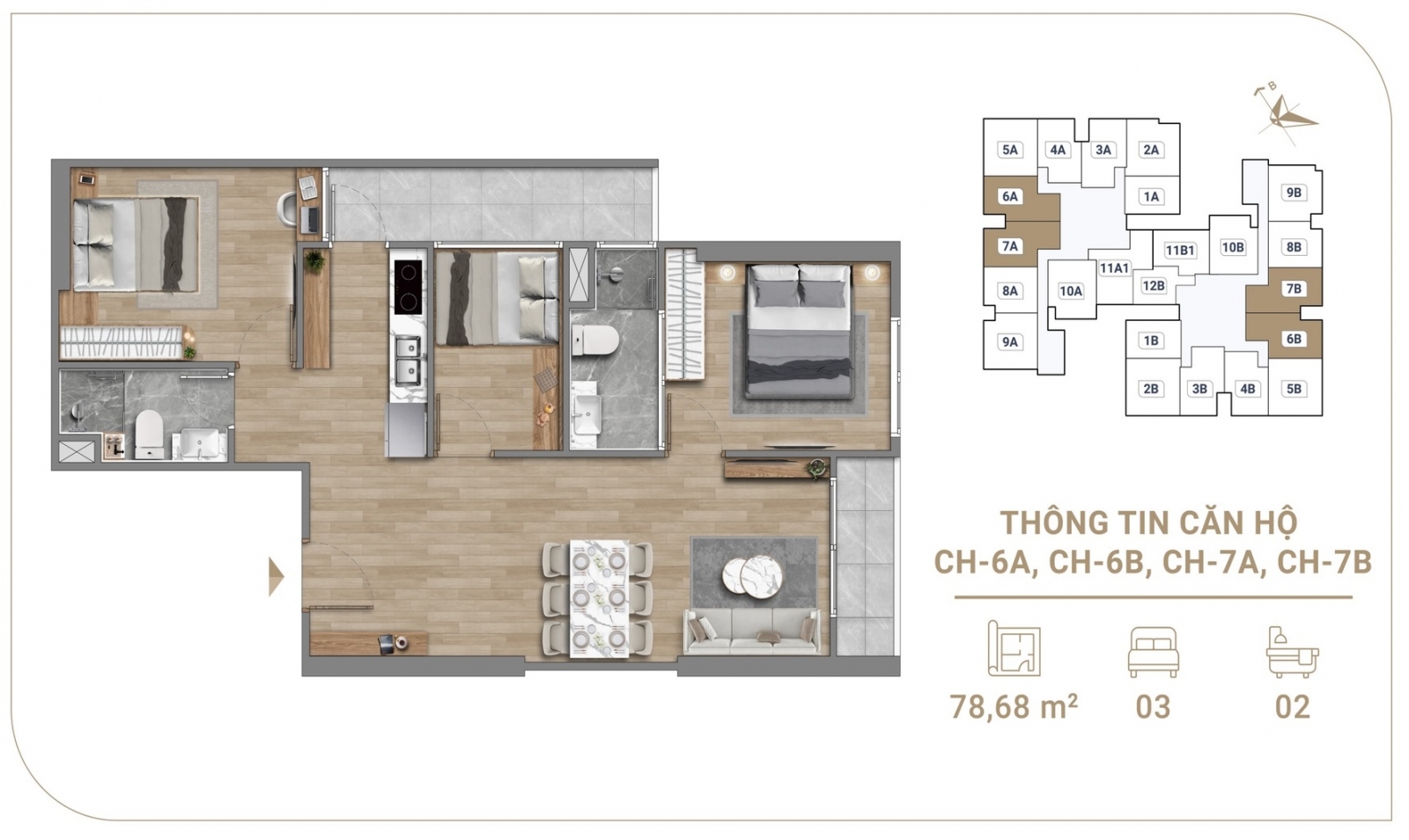 - Diện tích căn hộ: 56-65-67-76-77-79-80-98 m2