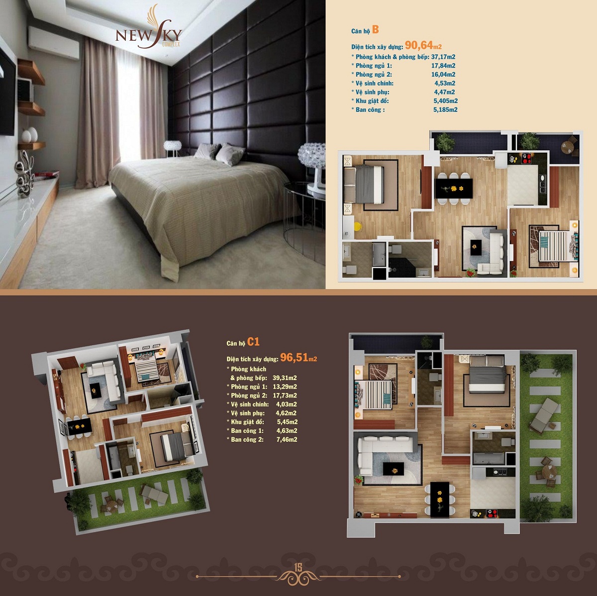 - Dự án Newsky Complex gồm 17 tầng nổi, hai tầng hầm hiện đại, trong đó 4 tầng khối đế dành cho văn phòng, nhà trẻ, trung tâm vui chơi giải trí, thể dục thể thao và mua sắm cho cư dân. Từ tầng 5-17 là khu căn hộ được thiết kế hiện đại, cao cấp với nhiều loại diện tích phù hợp từ 72 đến 127m2.