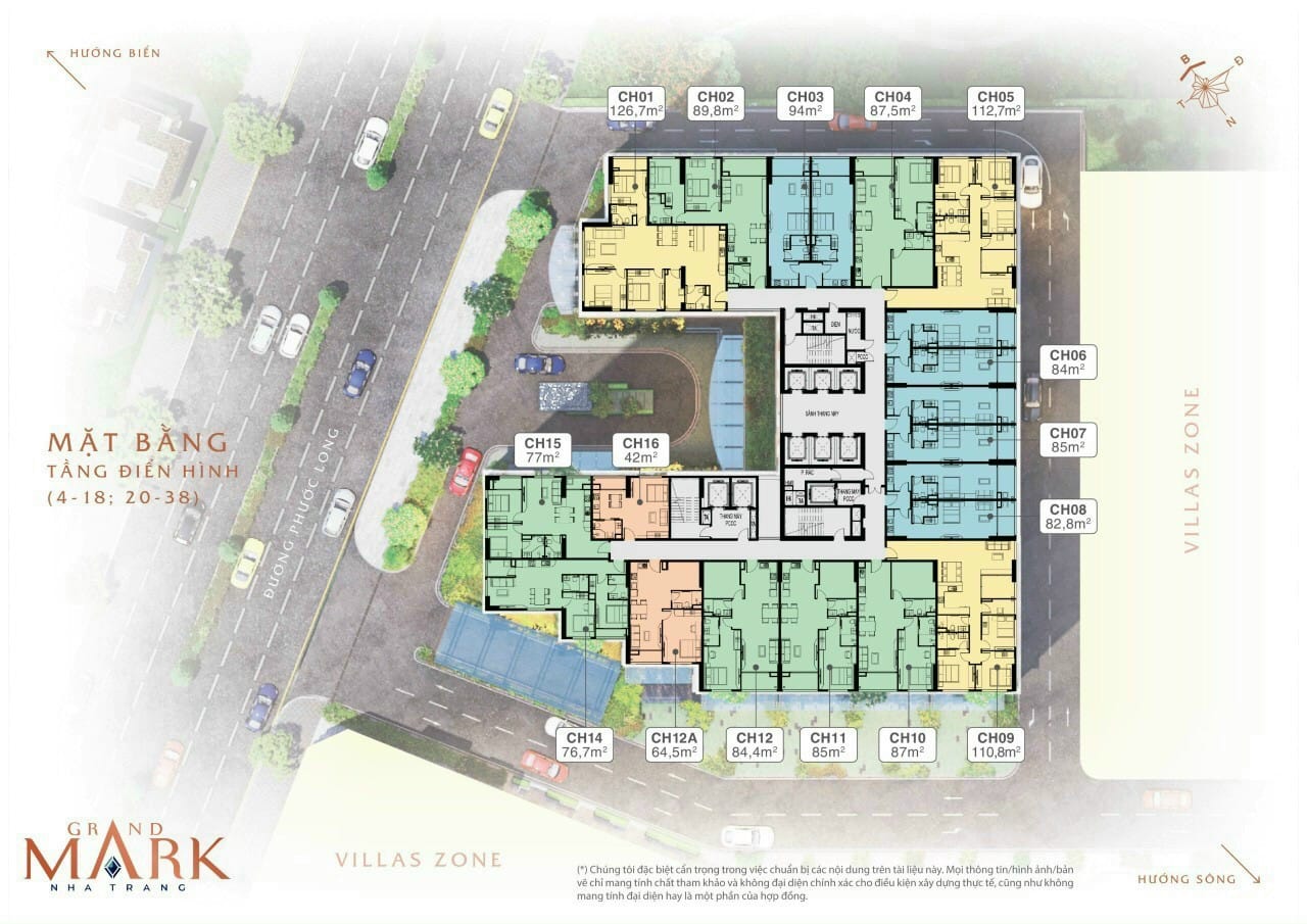 Quan trọng không kém vị trí và hệ thống tiện ích chính là mặt bằng căn hộ. Dự án Grand Mark Nha Trang được xây dựng trên tổng diện tích 10.168 m2 với 1 tòa nhà chung cư cao 39 tầng và 41 shophouse liền kề bao quanh.